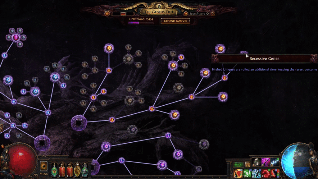 Genesis Tree má vlastní pasivní strom (ano, vážně,…) s možností specializovat se na určité typy odměn, kvalitu graftů nebo tzv. Foulborn mutace unikátek – ty budou módy unikátek nahrazovat speciálními módy.